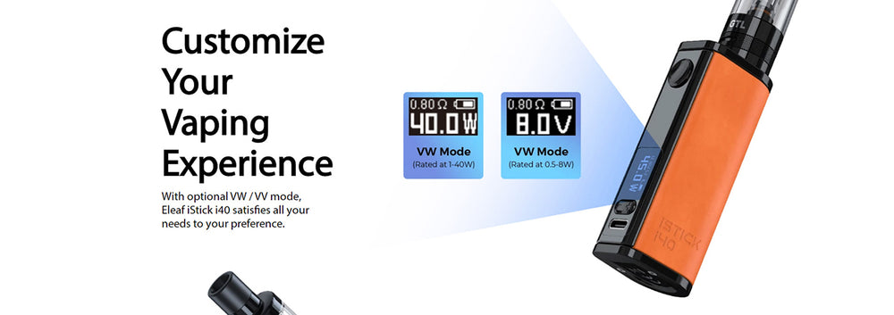 Eleaf iStick i40 Mod is companied by the monstrosity of its 2600mAh battery, which is rated for 1-40W output. Constructed from leather and metal, it combines both delicacy and compactness. It is compatible with GTL D20 Tank and GTL Coil. The OLED screen offers the optional VV/VW mode, it can better suit your preference.