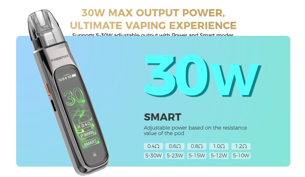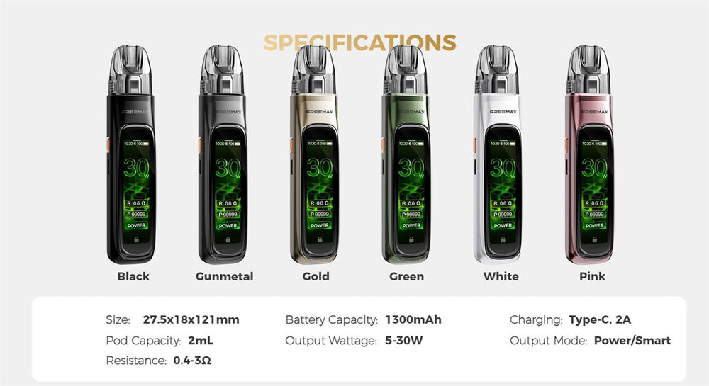Freemax Rexa Pro Pod System Kit is the new line of the Freemax Rexa series, featuring a 1300mAh built-in battery capable of super-fast recharging, a super large 3ml juice capacity and 30W max output.It is equipped with a full screen that shows important data, including output power and puff count & resistance. It offers seven safety protections so that you can enjoy vaping freely. With a super long lifespan and superior taste of Freemax Rexa Pro , your vaping experience will be extraordinary and superb.