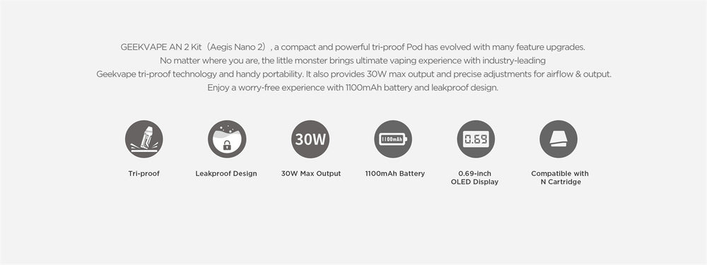 Geekvape AN2 Kit (Aegis Nano 2), a compact and powerful tri-proof Pod has evolved with many feature upgrades. No matter where you are, the little monster brings ultimate vaping experience with industry-leading Geekvape tri-proof technology and handy portability. It also provides 30W max output and precise adjustments for airflow & output. Enjoy a worry-free experience with 1100mAh battery and leakproof design.