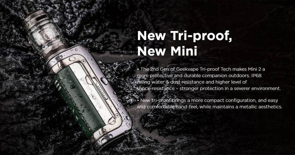 Geekvape M100 (Aegis Mini 2) Kit with Z (Zeus) Nano 2 Tank 3.5ml meet the new mini with new tri-proof. Aegis Mini 2 Kit with industry-leading IP68 rating water & dust resistance. Ground-breaking shock-resistance. An all-time stable output system. Built-in 2500mAh battery. Accidental press protection. Bigger screen with new UI. Type-C charging port with waterproof flip cover. And Geekvape Z Nano 2 Tank has a leak-proof design and is equipped with a top filling system. Top-to-bottom airflow can provide you with a cleaner and smoother experience. If you are looking for a new vape mod kit, Let's see how they can be the Mini.