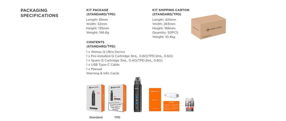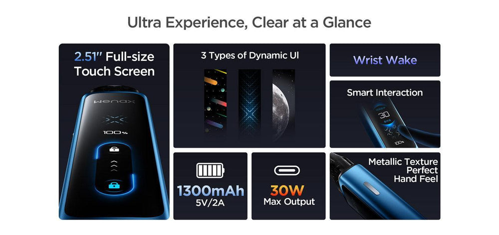 The Geekvape Wenax Q Ultra Pod Kit is a sleek and portable vape system, perfect for vapers of all levels. Features built in a long-lasting 1000mAh battery and fast USB-C charging, the Wenax Q Ultra ensures uninterrupted sessions. Its crisp OLED screen and intuitive controls make operation seamless, while the device supports both auto-draw and button activation for versatility. Compatible with 3ml Geek Vape Q side-top filling refillable Pods, it guarantees excellent flavour and ease of use. The Wenax Q Ultra Pod Vape Kit offers an adjustable wattage range of 5-25W, allowing you to personalise your experience. Durable and compact, the Wenax Q Ultra Pod Kit is designed for on-the-go convenience. Explore vaping with the stylish Geekvape Wenax Q Ultra, combining performance and simplicity effortlessly.
