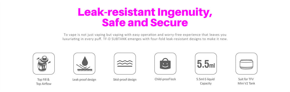 SMOK TF-D Subtank Sub Ohm Tank is a lightweight yet powerful sub-ohm tank for decent DTL vaping. Its can holding 5.5ml vape juice. compatible with SMOK D-Coil Series that is designed with hexagon-structure dual meshed heating wire for double performance and enhancing DTL style vaping. With the double top design (Top Airflow and Top Filling), the TF-D Sub Ohm Tank prevents potential e-juice leaks efficiently.
