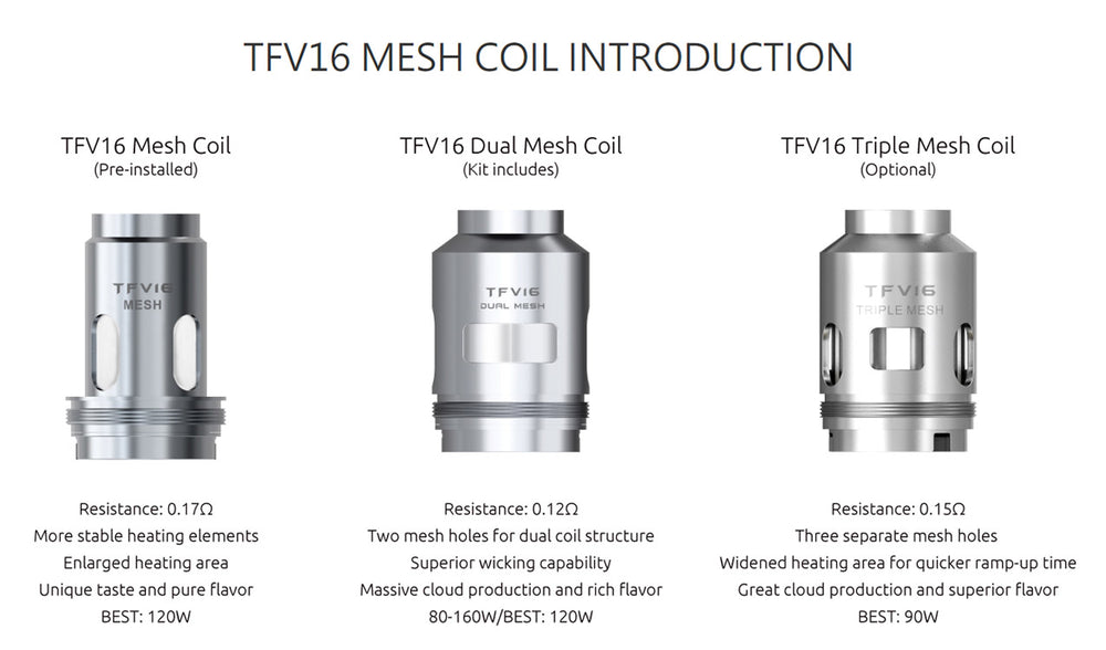 Coil type: Mesh Coil 0.17ohm (BEST: 120W ), Dual Mesh Coil 0.12ohm (BEST: 120W ), Triple Mesh Coil 0.15ohm (BEST: 90W )