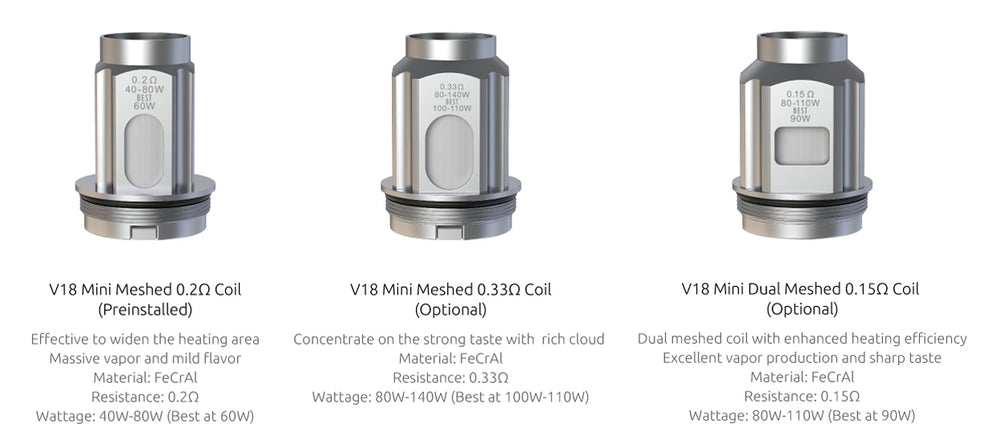 Smok TFV18 Mini Replacement Meshed Coil is designed for Smok TFV18 Mini Tank. There are three TFV18 Mini Meshed Coils for options: 0.2ohm meshed FeCrAl coil, 0.33ohm meshed FeCrAl coil and 0.15ohm dual meshed FeCrAl coil.