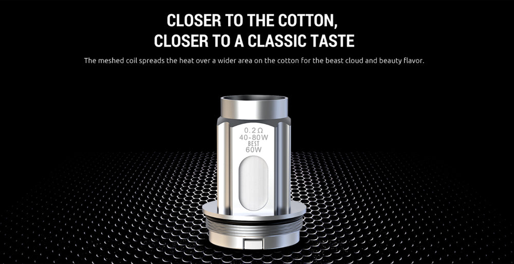 Resistance: 0.2ohm meshed FeCrAl coil (40-80W, best 60W)