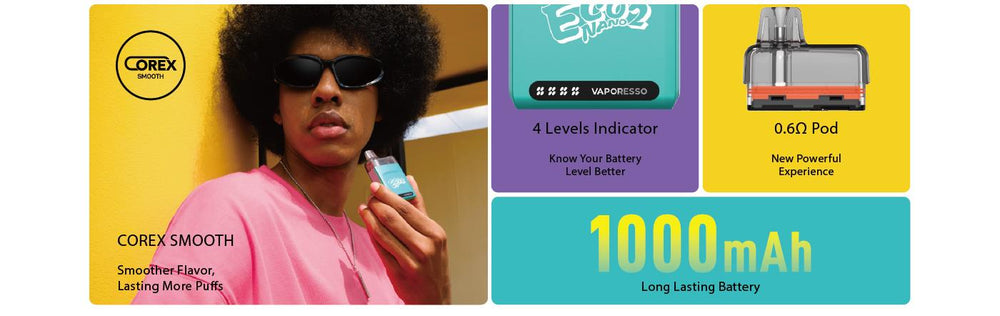 The ECO Nano 2 Pod system features a 1000mAh internal battery and a 6ml pod designed.Crafted from durable zinc alloy, Ideal for MTL vaping, it employs COREX heating technology for quick, flavorful draws and a leak-proof SSS design.4 Levels Indicator let you know the battery level ,the Eco Nano 2 is both lightweight and robust, ideal for vaping on the go.