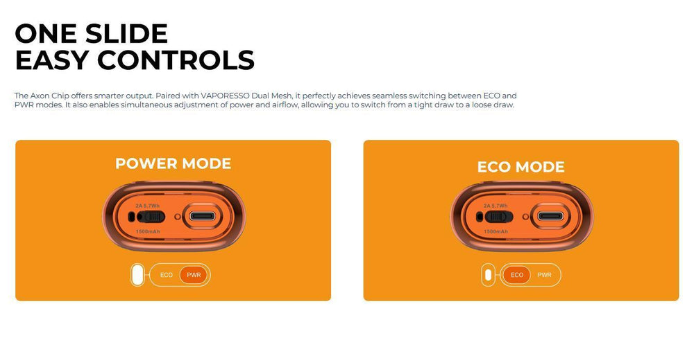 The Axon Chip offers smarter output. Paired with VAPORESSO Dual Mesh, it perfectly achieves seamless switching between ECO and PWR modes. It also enables simultaneous adjustment of power and airflow, allowing you to switch from a tight draw to a loose draw.