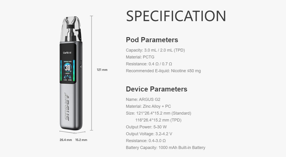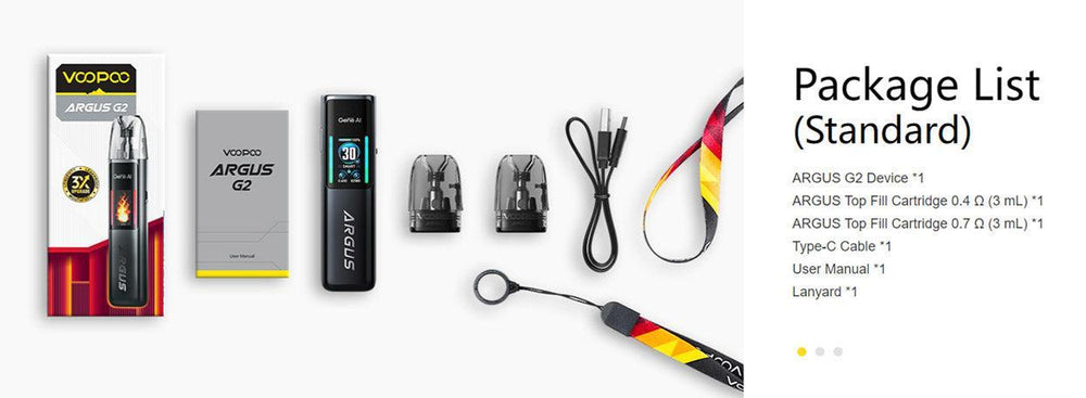 Argus G2 continues the smooth taste and feel of Argus G while delivering flexible and fun interactive features. It provides 3 UI interface choices and presents 3 animations including flames, flying saucers, and colorful cups with 3 power adjustment modes (Smart, Super, and ECO). Argus G2 Kit comes with a fully upgraded new cartridge, the Argus Top Fill Cartridge that features a 3ml capacity, 30-day without leakage, 90ml coil lifespan. Besides, it is also compatible with Argus Pod Family Devices (Side-fill Argus Pod 1.2ohm/0.7ohm). Designed with iCOSM CODE, VOOPOO Argus G2 will bring you a diverse vaping experience from MTL to RDL. Featuring 1000mAh built-in battery, it can provide long-lasting power for up to 30W.