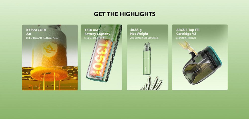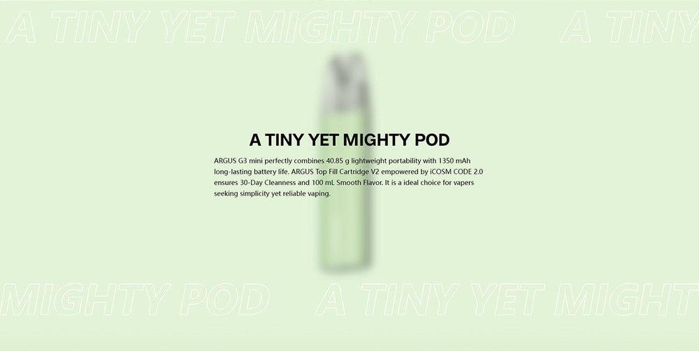 Voopoo ARGUS G3 mini Pod Kit featuring a reusable 1350mAh battery, 3ml e-juice volume and an indicator light for battery level. Although the ARGUS G3 Mini Kit is more portable and light in weight, it still guarantees decent vaping. ARGUS Top Fill Cartridge V2 empowered by ICOSM CODE 2.0 ensures 30-day Cleanness and 100 ml Smooth Flavor . It is a ideal choice for vapers seeking simplicity yet reliable vaping.