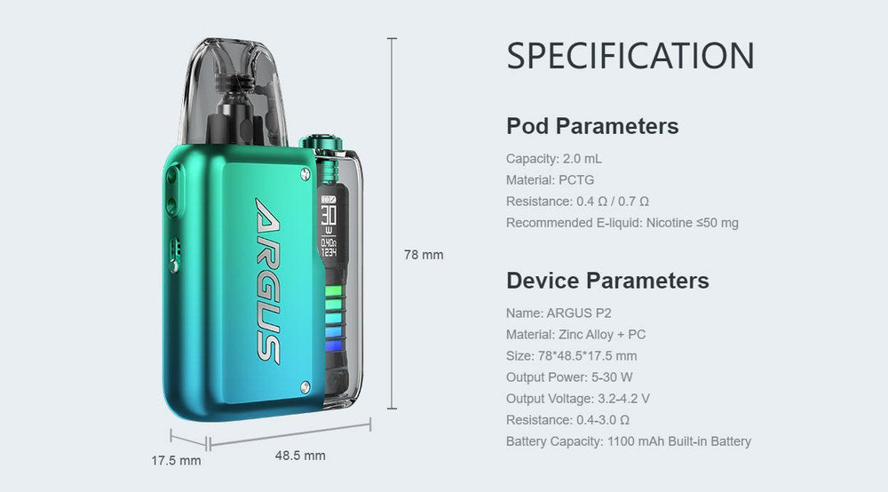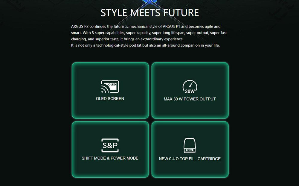 ARGUS P2 continues the futuristic mechanical style of ARGUS P1 and becomes agile and smart. With 5 super capabilities, super capacity, super long lifespan, super output, super fast charging, and superior taste, it brings an extraordinary experience. It is not only a technological-style pod kit but also an all-around companion in your life.