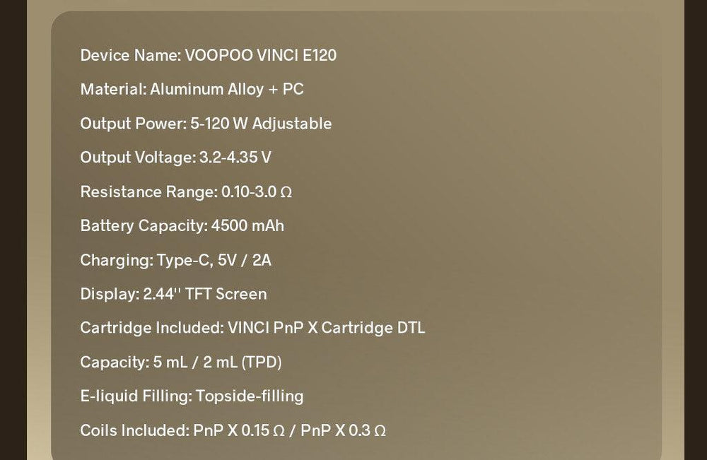 VOOPOO VINCI E120 represents an innovative creation that harmonizes aesthetics with exceptional performance. The 2.4-inch TFT high-resolution display functions as a canvas in the palm of hands, incorporating up to 18 exquisite watch-face screensavers for personalized customization. As a pioneering POD device from VOOPOO, VOOPOO VINCI E120 adeptly merges the robust performance of a traditional MOD with the lightweight convenience of a POD system. The flat, pocket-sized design ensures effortless portability, yet the built-in 4500mAh high-capacity battery provides long-lasting vaping duration up to 10 days* with a single charge. With a substantial 120 W power output, it enables the immediate release of potent energy, delivering an exhilarating DTL vaping.