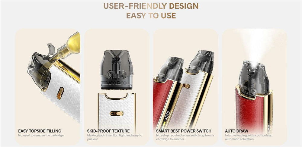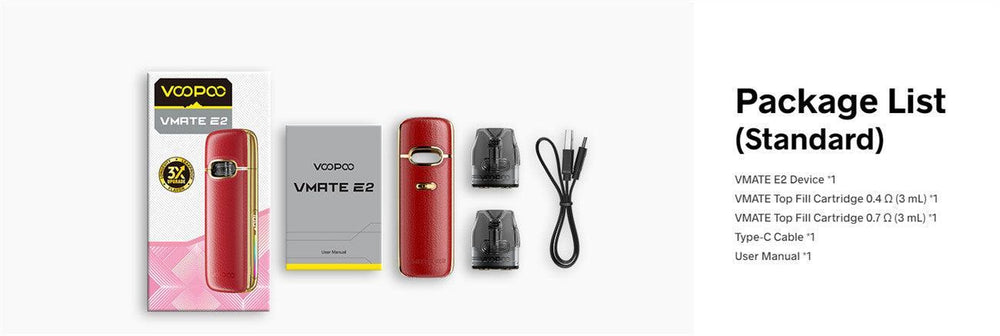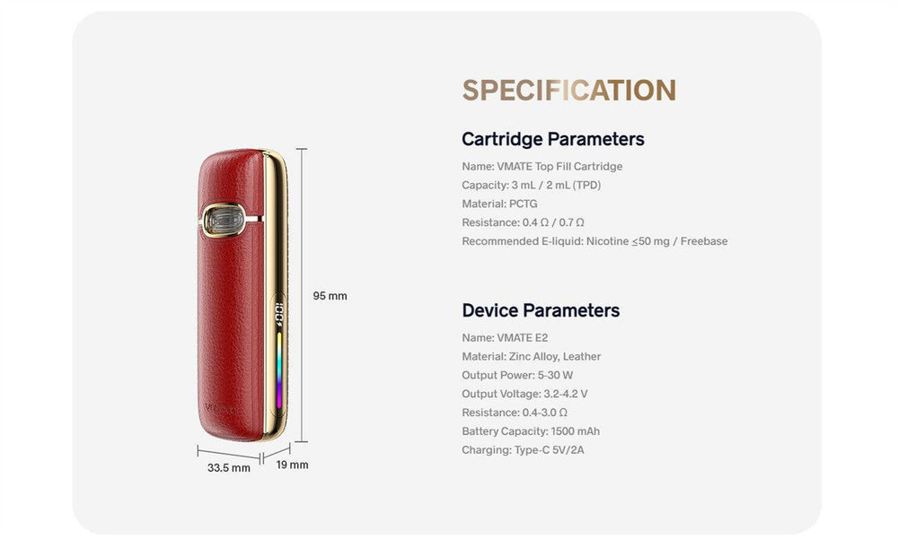 Building on the iconic design of the VMATE E, the latest VMATE E2 delivers even more fabulous elegance with an upgraded double-sided leather and magnetic cover. 3X upgraded new cartridges provide an enhanced pure vaping experience,and an increased power of 1500 mAh for multiple days of use.and power by built-in 1500mAh battery, and 30w max output wattage,and the 3ml volume ejuice capacity for daily use without frequent refilling. compatible with all VMATE Top Fill Cartridges and VMATE side filling series.The gradient color light bar on the side of the device,along with a percentage display of the battery level.